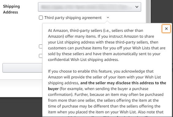 You must have "third party selling" turned OFF on your wishlist. this setting ensures that nobody buying you items will be able to see your address.
